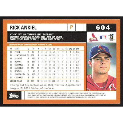 This is a 2002 Topps Rick Ankiel baseball card. The card is #604 and pictures show condition.