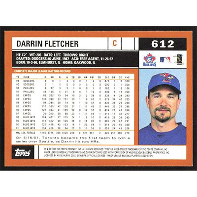 This is a 2002 Topps Darrin Fletcher baseball card. The card is #612 and pictures show condition.