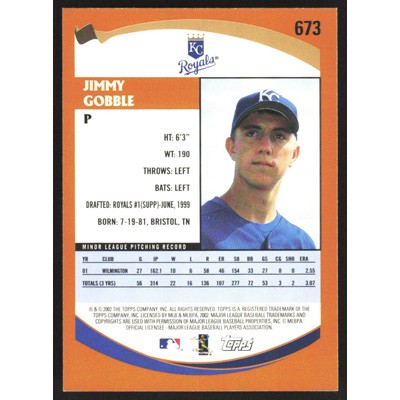 This is a 2002 Topps Jimmy Gobble Prospects baseball card. The card is #673 and pictures show condition. Team(s): Kansas City Royals Rookie Card (RC)