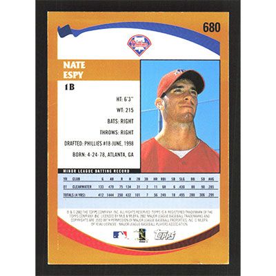 This is a 2002 Topps Nate Espy Prospects baseball card. The card is #680 and pictures show condition. Team(s): Philadelphia Phillies Rookie Card (RC)