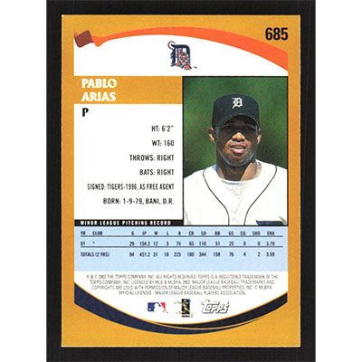 This is a 2002 Topps Pablo Arias Prospects baseball card. The card is #685 and pictures show condition.