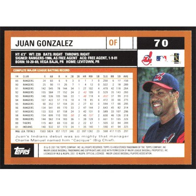 This is a 2002 Topps Juan Gonzalez baseball card. The card is #70 and pictures show condition.