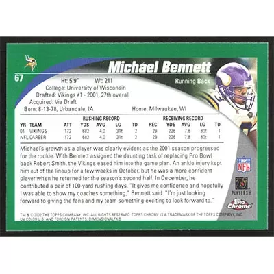 This is a 2002 Topps Chrome Michael Bennett football card. The card is #67 and pictures show condition.