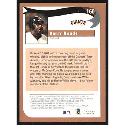 This is a 2002 Topps Opening Day Barry Bonds Season Highlights baseball card. The card is #160 and pictures show condition. Team(s): San Francisco Giants