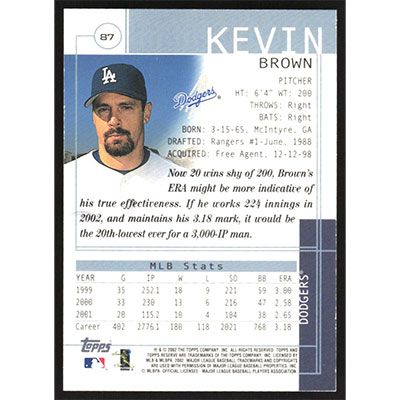 This is a 2002 Topps Reserve Kevin Brown baseball card. The card is #87 and pictures show condition.