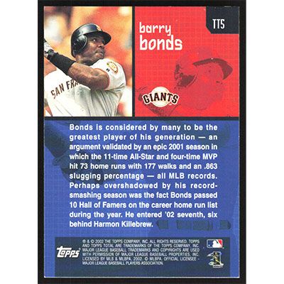This is a 2002 Topps Total Barry Bonds baseball card. The card is #TT5 and pictures show condition.