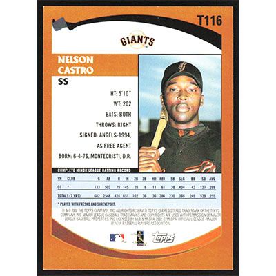 This is a 2002 Topps Traded Nelson Castro Prospects baseball card. The card is #T116 and pictures show condition. Team(s): San Francisco Giants Rookie Card (RC)