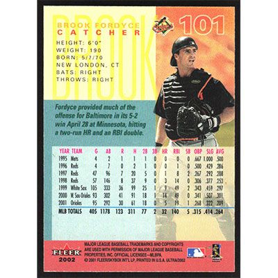 This is a 2002 Ultra Brook Fordyce baseball card. The card is #101 and pictures show condition.