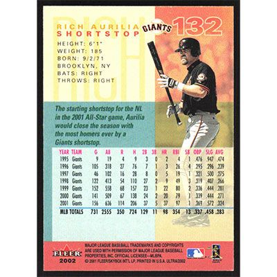 This is a 2002 Ultra Rich Aurilia baseball card. The card is #132 and pictures show condition.