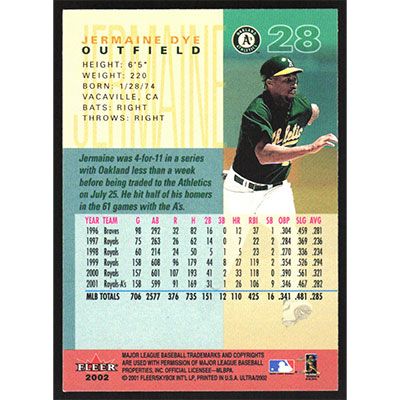 This is a 2002 Ultra Jermaine Dye baseball card. The card is #28 and pictures show condition.