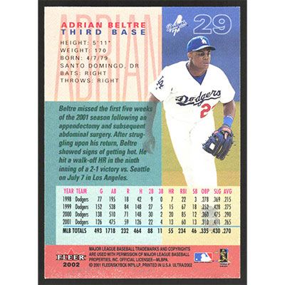 This is a 2002 Ultra Adrian Beltre baseball card. The card is #29 and pictures show condition.