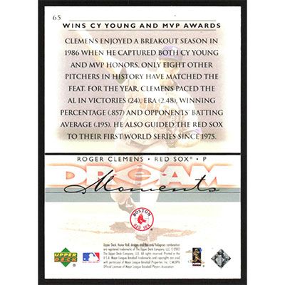 This is a 2002 Upper Deck Honor Roll Roger Clemens Dream Moments baseball card. The card is #65 and pictures show condition.