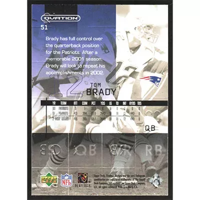This is a 2002 Upper Deck Ovation Tom Brady football card. The card is #51 and pictures show condition.
