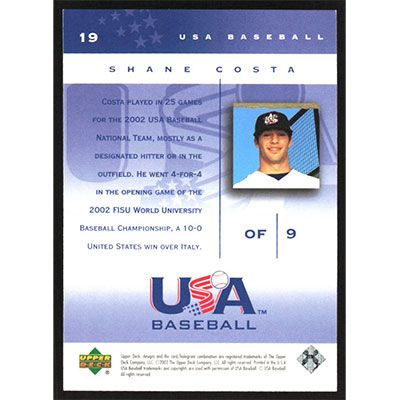 This is a 2002 USA Baseball National Team Shane Costa baseball card. The card is #19 and pictures show condition.
