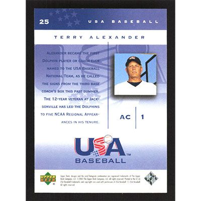 This is a 2002 USA Baseball National Team Terry Alexander baseball card. The card is #25 and pictures show condition.