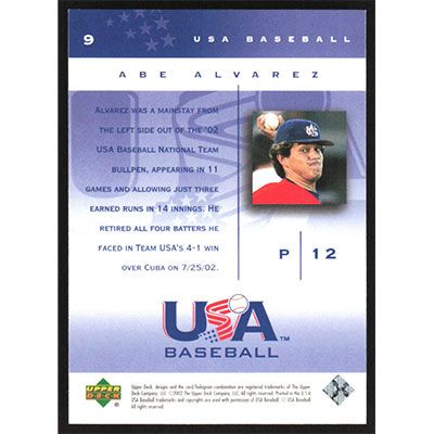 This is a 2002 USA Baseball National Team Abe Alvarez baseball card. The card is #9 and pictures show condition.