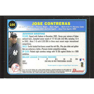 This is a 2003 Bowman Jose Contreras baseball card. The card is #166 and pictures show condition.