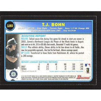 This is a 2003 Bowman T.J. Bohn baseball card. The card is #180 and pictures show condition.