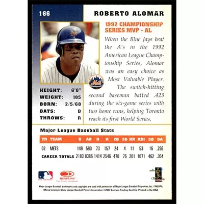 This is a 2003 Donruss Champions Roberto Alomar baseball card. The card is #166 and pictures show condition.