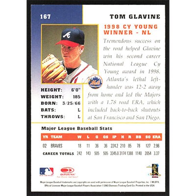 This is a 2003 Donruss Champions Tom Glavine baseball card. The card is #167 and pictures show condition.