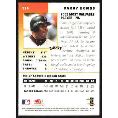 This is a 2003 Donruss Champions Barry Bonds baseball card. The card is #224 and pictures show condition.