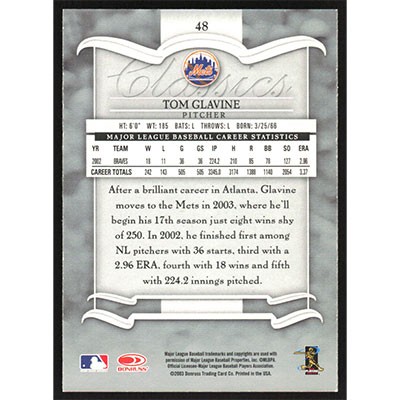 This is a 2003 Donruss Classics Tom Glavine baseball card. The card is #48 and pictures show condition.