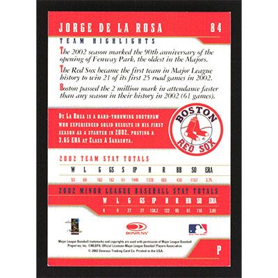 This is a 2003 Donruss Team Heroes Jorge De La Rosa baseball card. The card is #84 and pictures show condition.