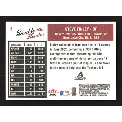 This is a 2003 Fleer Double Header Steve Finley baseball card. The card is #5 and pictures show condition.