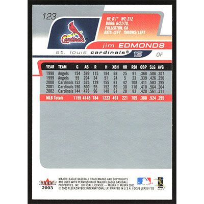 This is a 2003 Fleer Focus Jersey Edition Jim Edmonds baseball card. The card is #123 and pictures show condition.