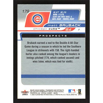 This is a 2003 Fleer Focus Jersey Edition Matt Bruback baseball card. The card is #179 and pictures show condition. Team(s): Chicago Cubs Rookie Card (RC)