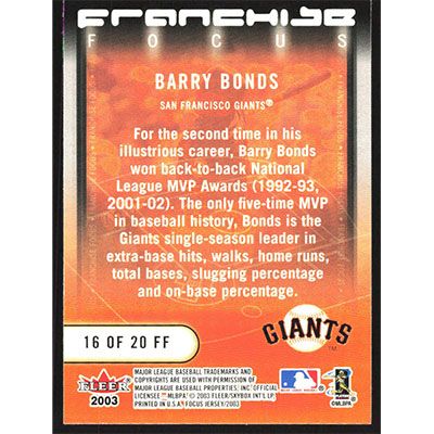This is a 2003 Fleer Focus Jersey Edition Franchise Focus Barry Bonds baseball card. The card is #16 and pictures show condition. Team(s): San Francisco Giants