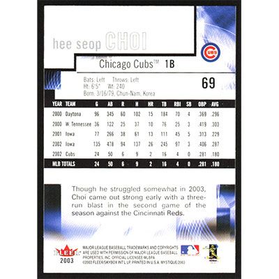 This is a 2003 Fleer Mystique Hee Seop Choi baseball card. The card is #69 and pictures show condition.