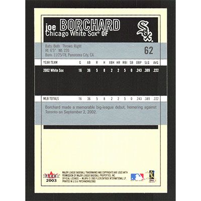 This is a 2003 Fleer Patchworks Joe Borchard baseball card. The card is #62 and pictures show condition.