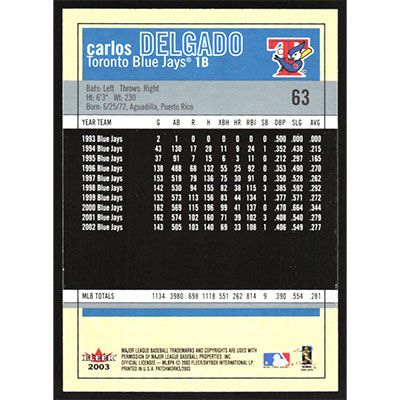 This is a 2003 Fleer Patchworks Carlos Delgado baseball card. The card is #63 and pictures show condition.
