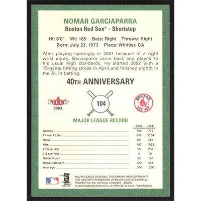 This is a 2003 Fleer Tradition Nomar Garciaparra baseball card. The card is #104 and pictures show condition.