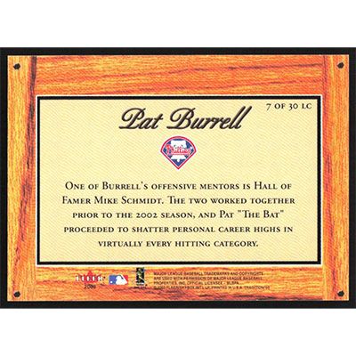 This is a 2003 Fleer Tradition Lumber Company Pat Burrell baseball card. The card is #7 and pictures show condition.