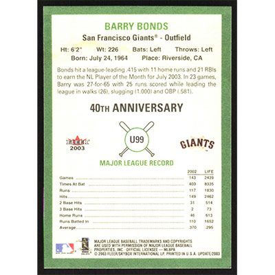 This is a 2003 Fleer Tradition Update Barry Bonds baseball card. The card is #U99 and pictures show condition.