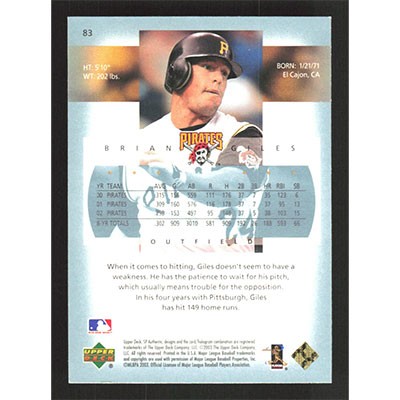 This is a 2003 SP Authentic Brian Giles baseball card. The card is #83 and pictures show condition.