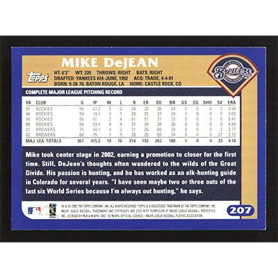 This is a 2003 Topps Mike Dejean baseball card. The card is #207 and pictures show condition.