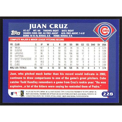 This is a 2003 Topps Juan Cruz baseball card. The card is #228 and pictures show condition.