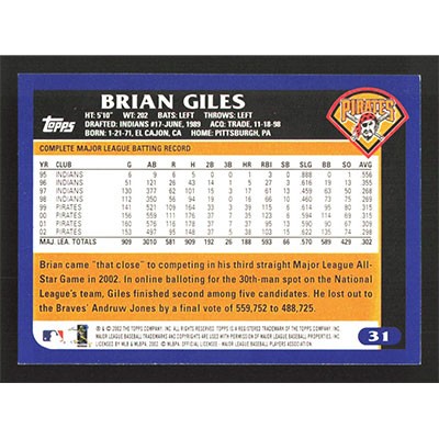 This is a 2003 Topps Brian Giles baseball card. The card is #31 and pictures show condition.