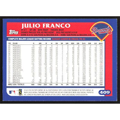 This is a 2003 Topps Julio Franco autographed baseball card. This card has been signed, in blue, by Julio Franco, and is guaranteed authentic by Ballcardz.com. The card is #409 and pictures show condition.