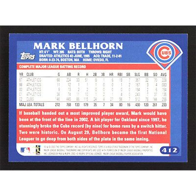 This is a 2003 Topps Mark Bellhorn baseball card. The card is #412 and pictures show condition.