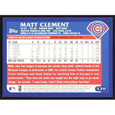 This is a 2003 Topps Matt Clement baseball card. The card is #539 and pictures show condition.