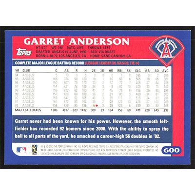 This is a 2003 Topps Garret Anderson baseball card. The card is #600 and pictures show condition.