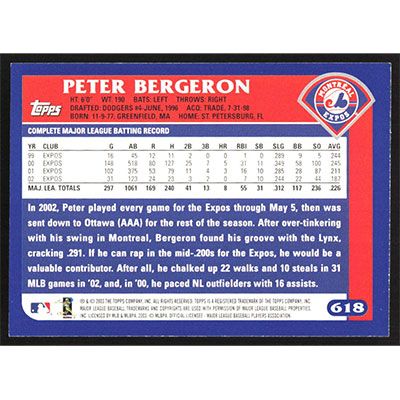This is a 2003 Topps Peter Bergeron baseball card. The card is #618 and pictures show condition.