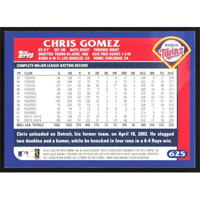 This is a 2003 Topps Chris Gomez baseball card. The card is #625 and pictures show condition.