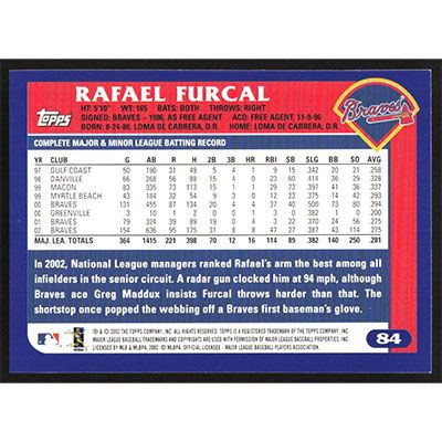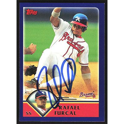 This is a 2003 Topps Rafael Furcal autographed baseball card. This card has been signed, in blue, by Rafael Furcal, and is guaranteed authentic by Ballcardz.com. The card is #84 and pictures show condition.
