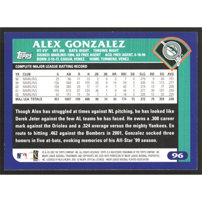 This is a 2003 Topps Alex Gonzalez baseball card. The card is #96 and pictures show condition.