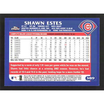 This is a 2003 Topps Chrome Shawn Estes baseball card. The card is #389 and pictures show condition.